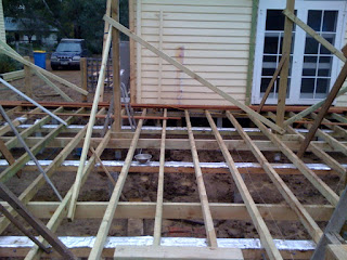 The verandah has walls of the house on 2 sides, and the 2 open sides have steps going all the way around. This pic shows the step structure being made, prior to the concrete being poured around the spigots which help support this external structure.